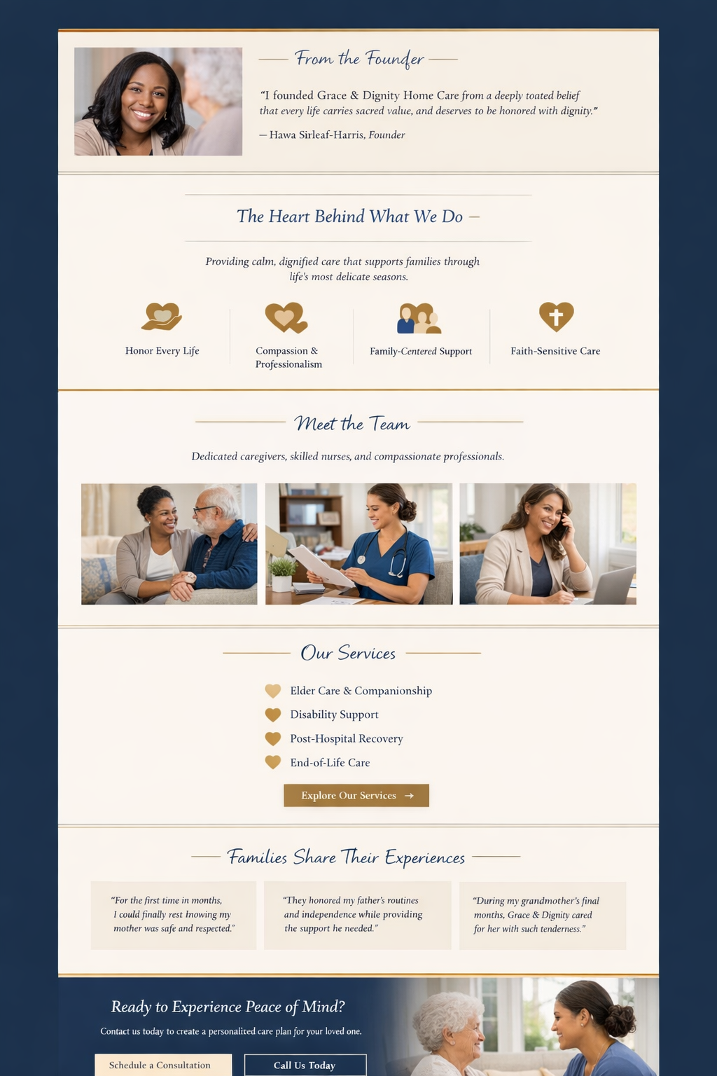 At Grace & Dignity Home Care, our team is more than just caregivers; they are individuals chosen for their compassion, skill, and unwavering commitment to preserving dignity, honoring independence, and restoring peace. Every member, from our clinicians to our support staff, shares a common goal: to deliver care that is not just excellent, but truly heartfelt.